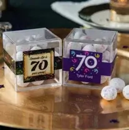Personalized Milestones 70th Birthday Years in the Making JUST CANDY® favor cube with Sugar Sanded Gummy Bears