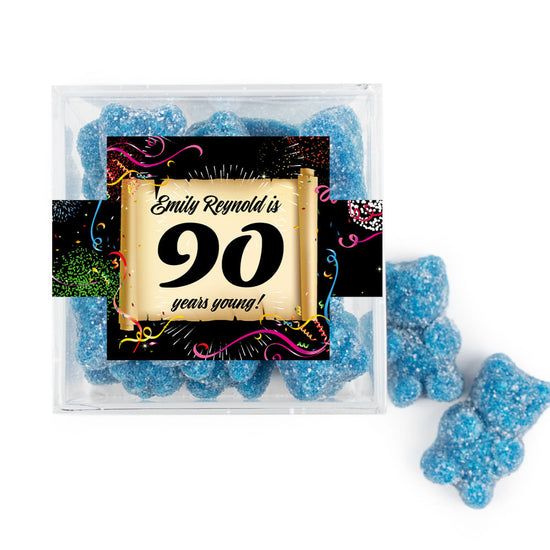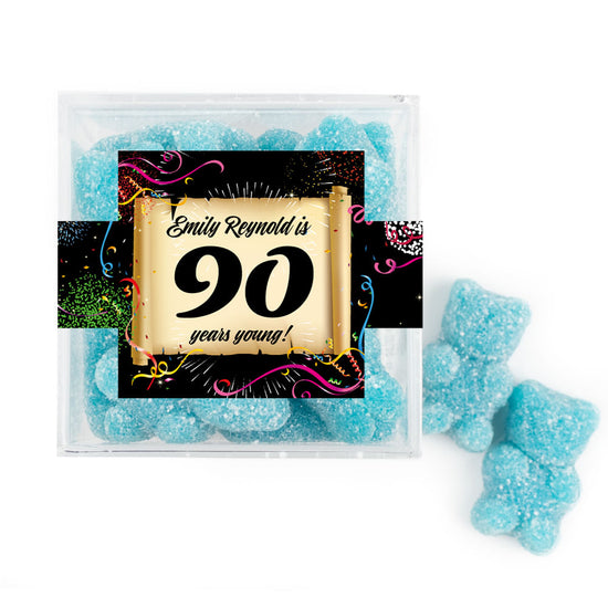 Personalized Milestones 90th Birthday Confetti Scroll JUST CANDY® favor cube with Sugar Sanded Gummy Bears