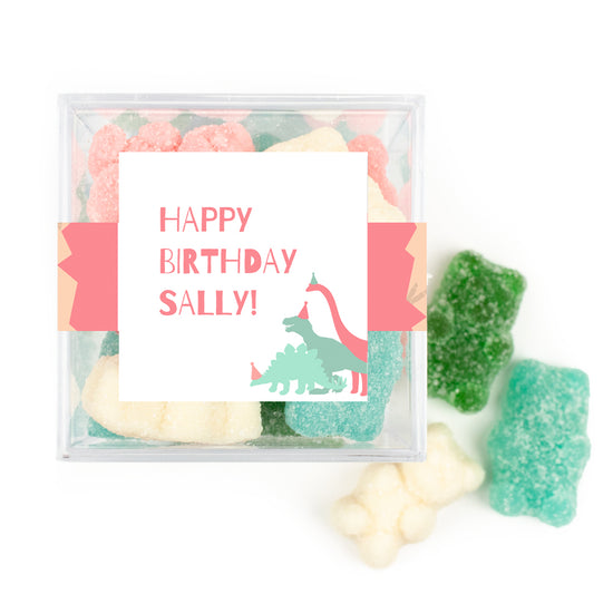 Personalized Dinosaur Birthday JUST CANDY® favor cube with Sugar Sanded Gummy Bears Pink Dino
