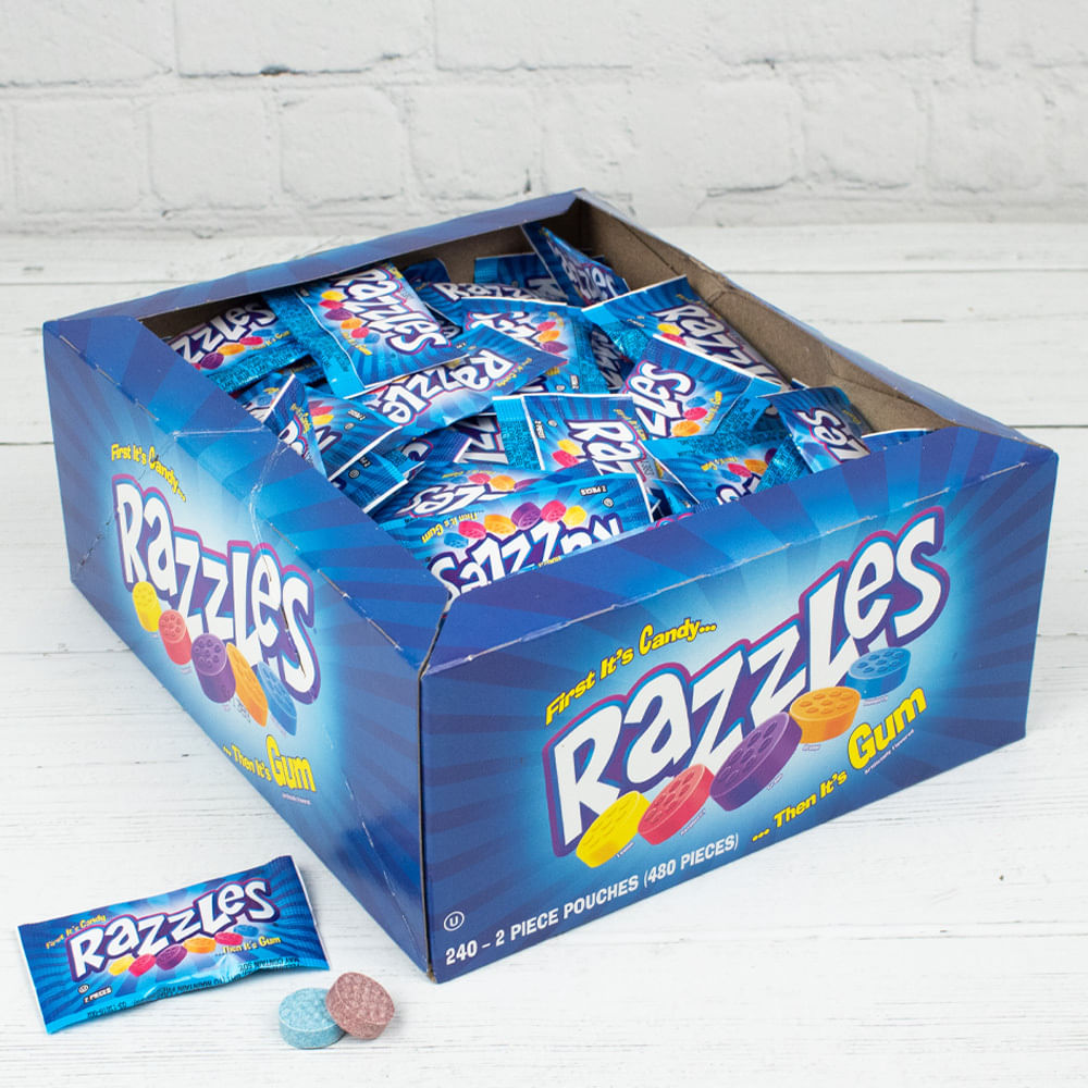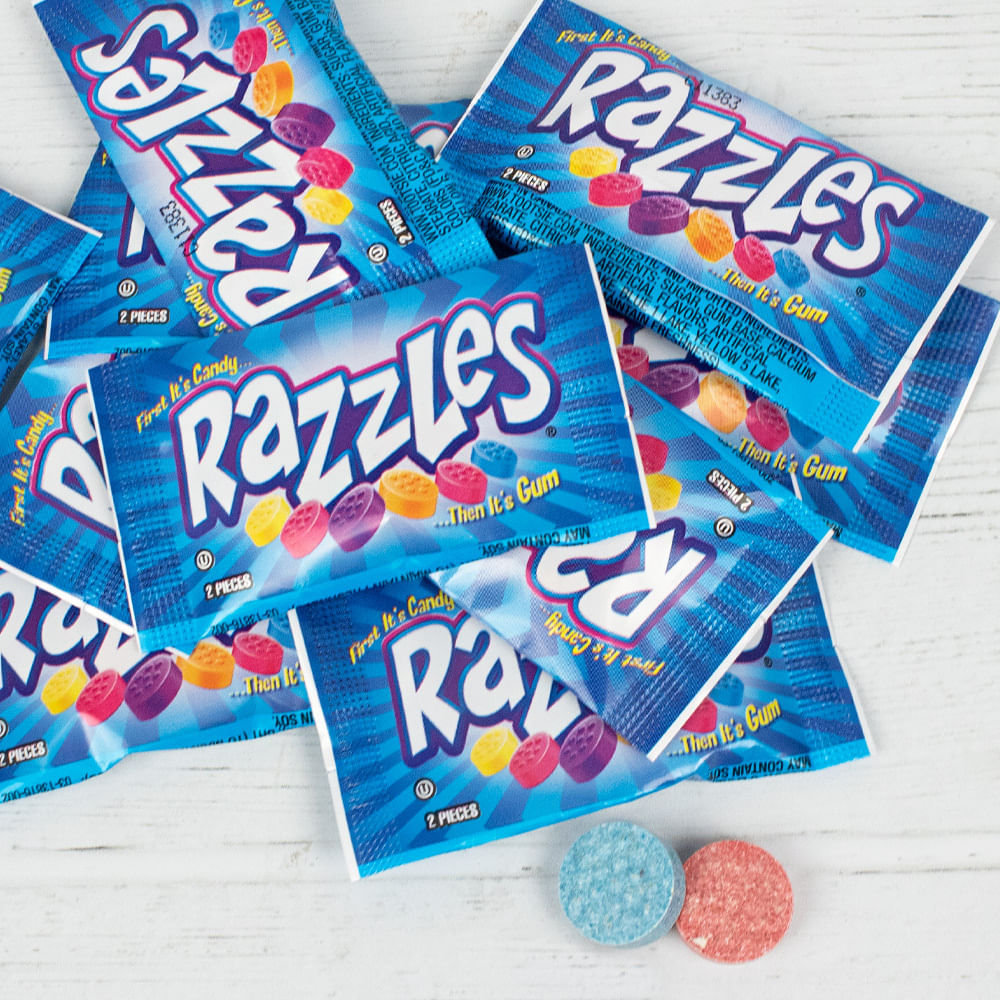 Sugar, Gum Base, Calcium Stearate, Citric Acid, Artificial Flavors, Artificial Colors (FD&C Red 40 Lake, Blue 1 Lake, Yellow 5 lake, Yellow 6 Lake), BHT (to maintain freshness). Soy may be present.