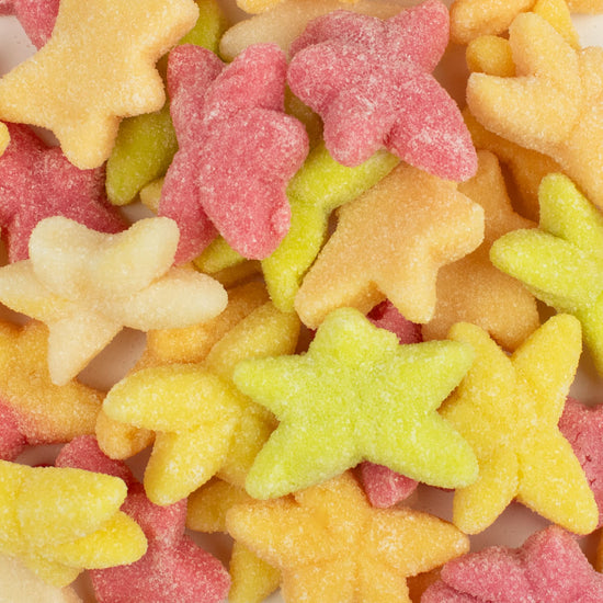 Glucose Syrup (corn & wheat), sugar, gelatine (pork), acidifiers (citric acid), coloring: (tumeric-natural, carmine natural, blue no 1- artificial, titanium dioxide- artificial, natural flavorings: apple, orange, raspberry, pear