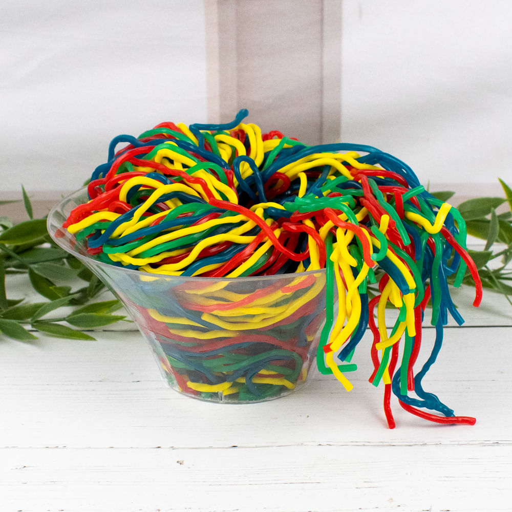 Glucose -fructose syrup, wheat flour, dextrose, palm oil, citric acid, flavoring, colors (curcumin, FD&C red 40, brilliant blue FCF, titanium dioxide, antioxidants (ascorbic acid, tocopherol-rich extract). Glazing agent (white beeswax). Contains wheat ingredients.