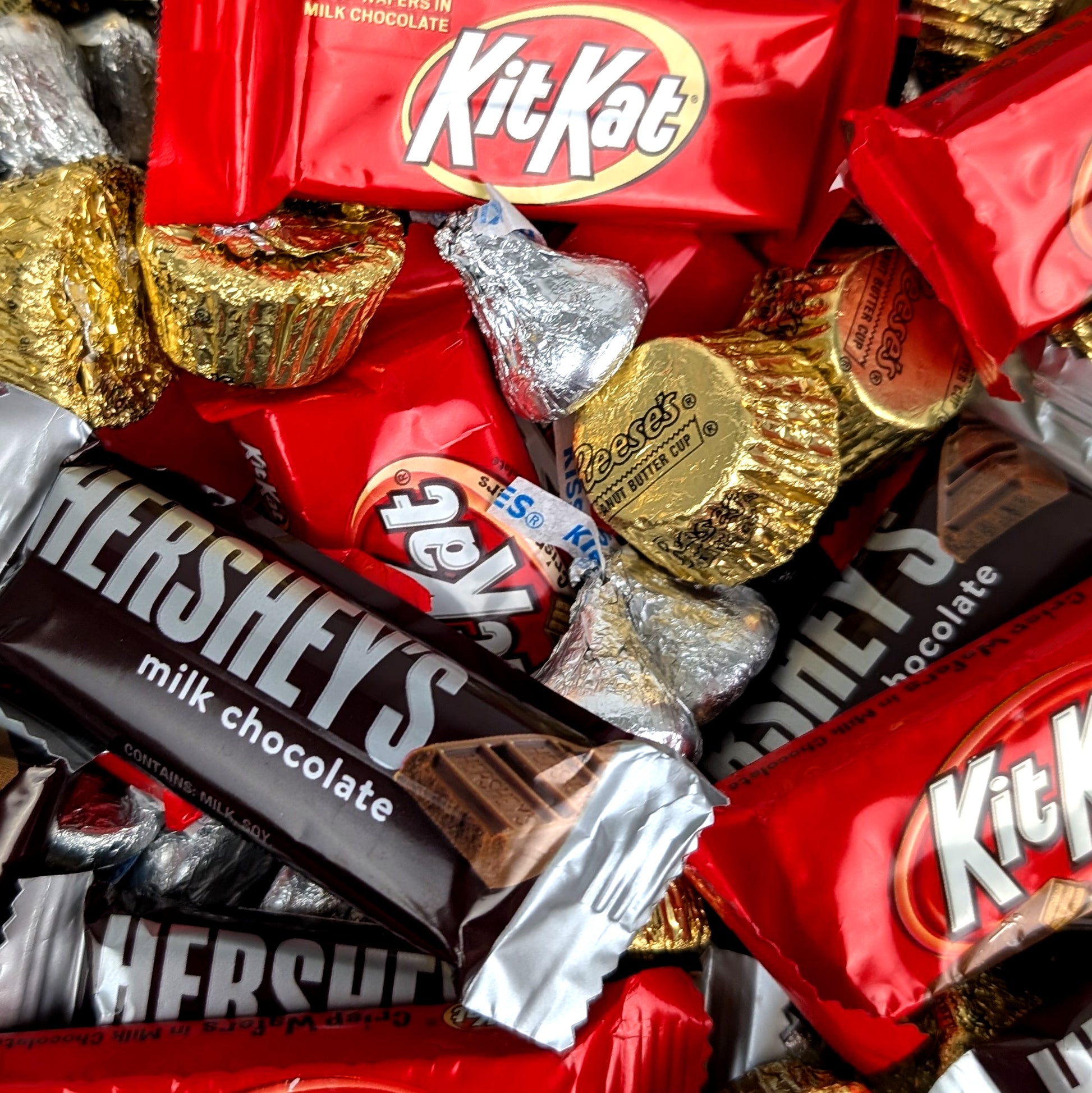 - Candy Mix Consists of Hershey's Snack Size Milk Chocolate Bars, Snack Size Kit Kats, Reese's Peanut Butter Cup Miniatures, and Hershey's Milk Chocolate Kisses