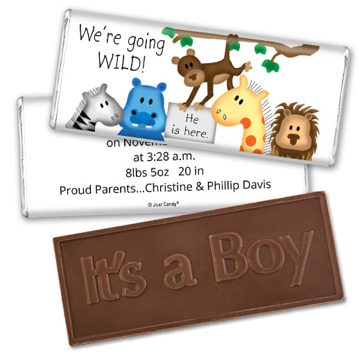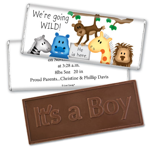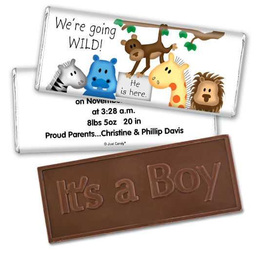 Baby Boy Announcement Personalized Embossed Chocolate Bar Going Wild Jungle Animals