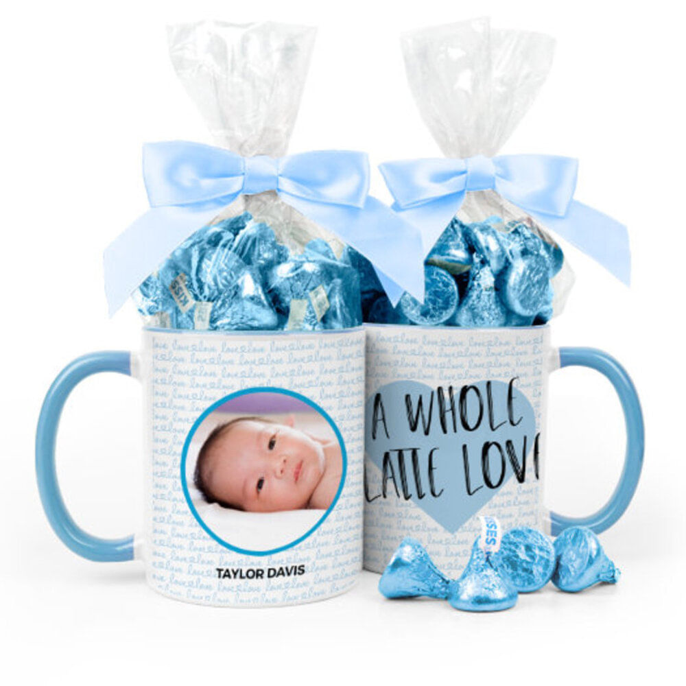 Personalized Baby Boy Announcement Latte Love 11oz Mug with Hershey's Kisses