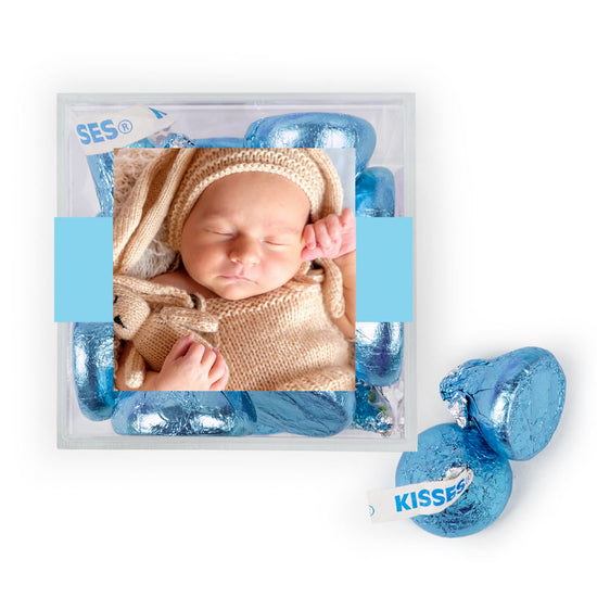 Personalized Boy Birth Announcement He's Here! JUST CANDY® favor cube with Hershey's Kisses