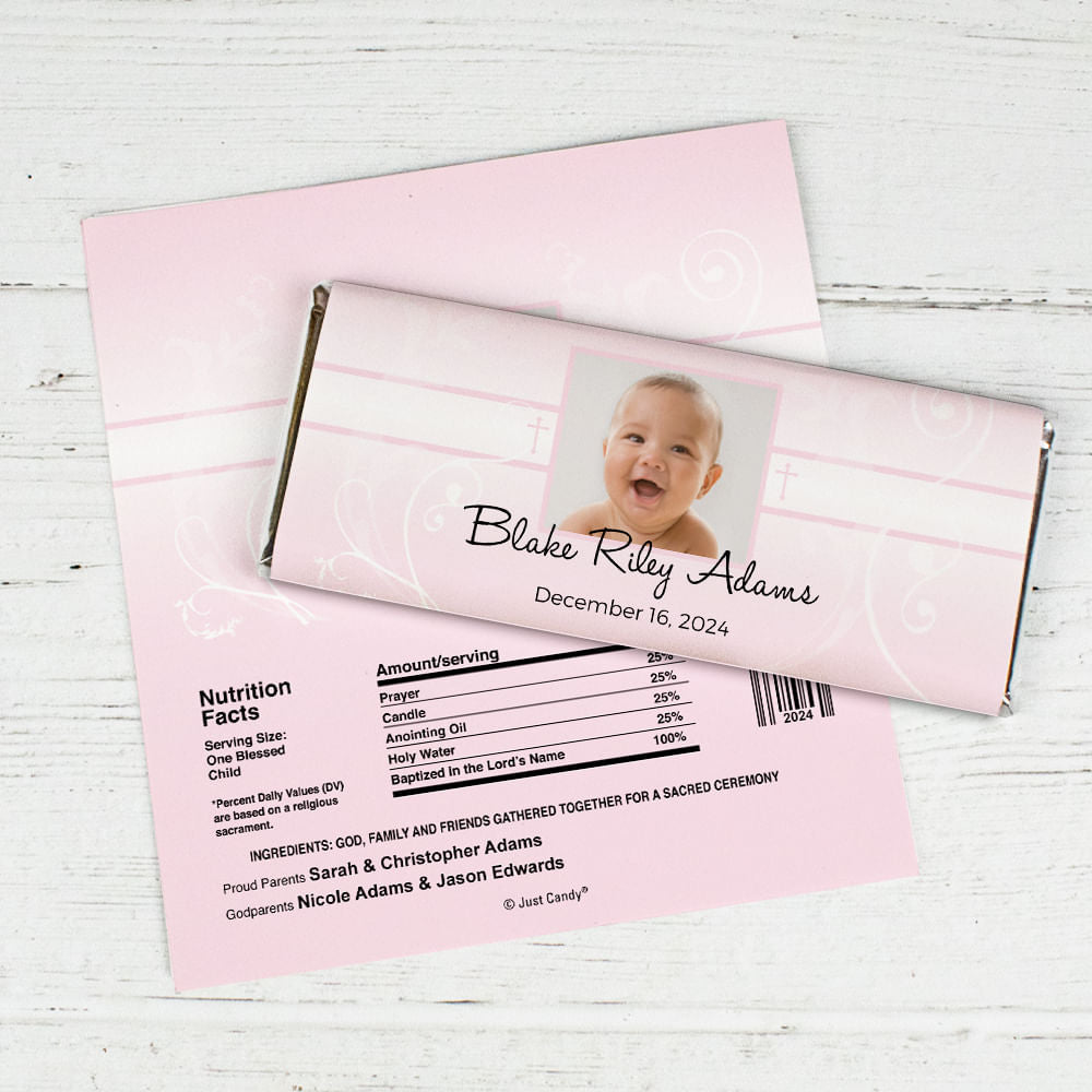Baptism Personalized Chocolate Bar Wrappers Photo, Cross & Scroll