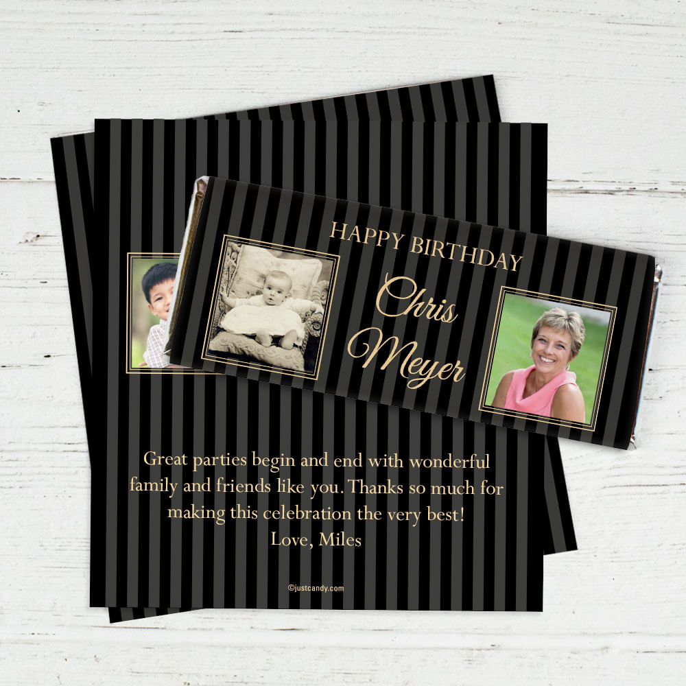 Birthday Personalized Chocolate Bar Wrappers Pinstripe Then and Now Photos