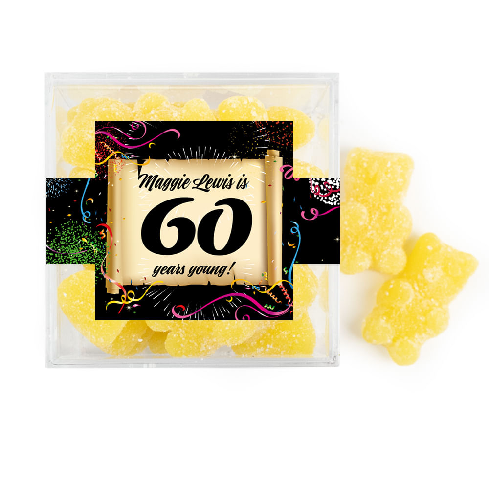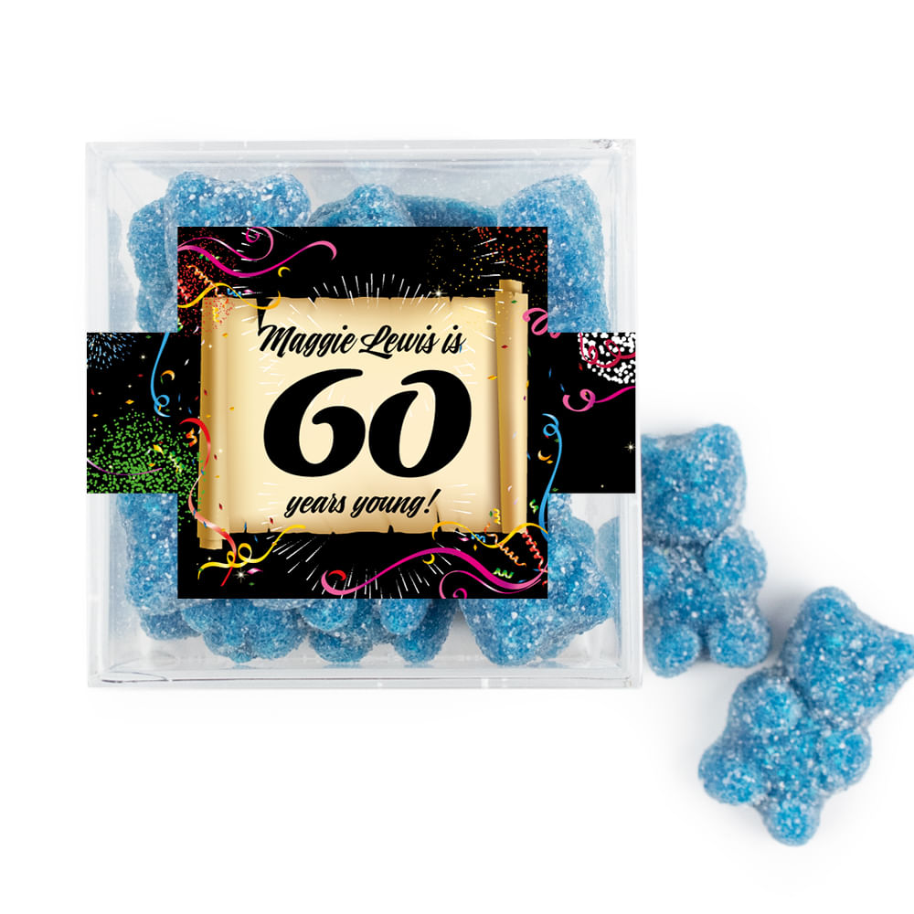 Personalized Milestones 60th Birthday Confetti Scroll JUST CANDY® favor cube with Sugar Sanded Gummy Bears