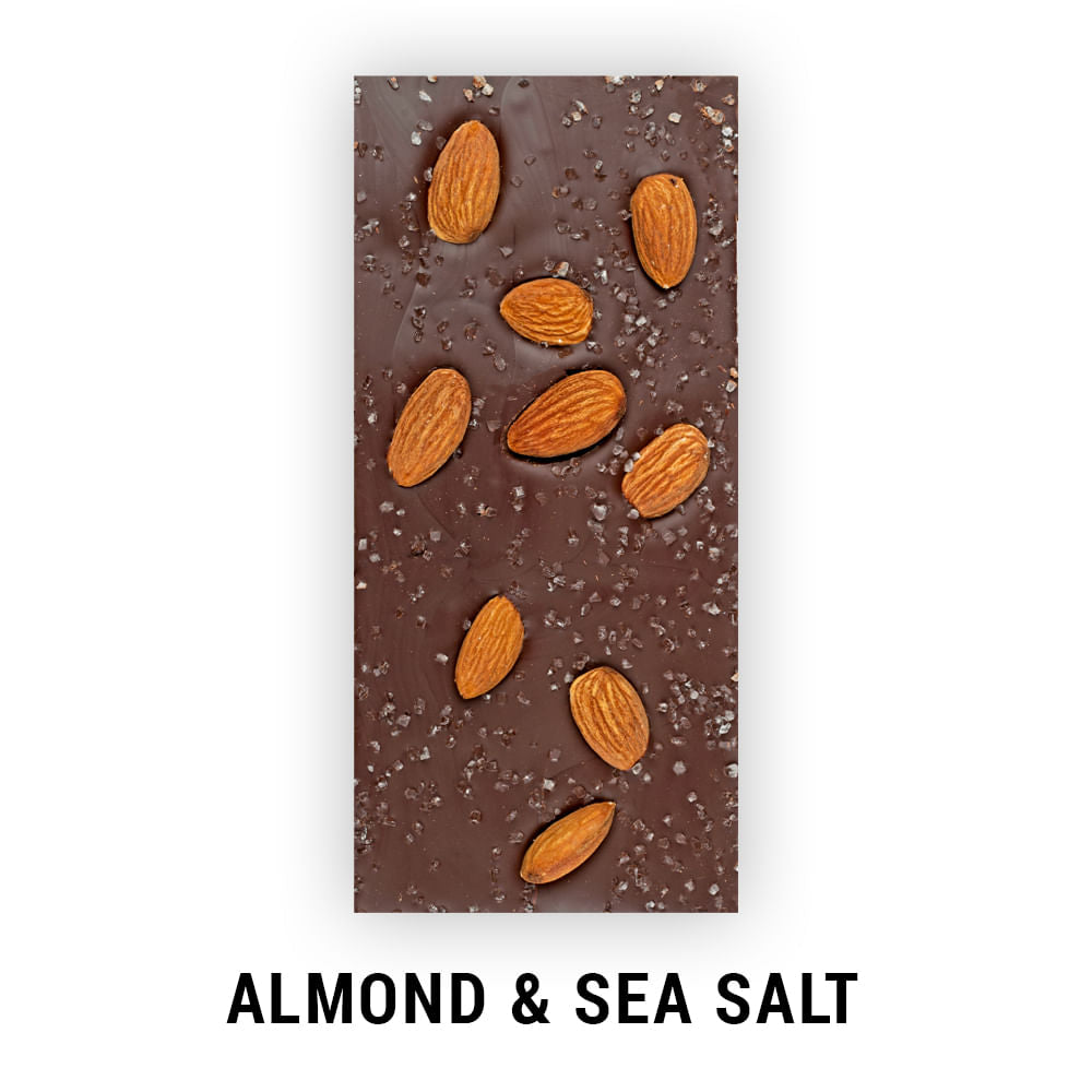 - Almond & Sea Salt: Deep, Dark Chocolate with Whole Salted Almonds floating on top with sprinkles of Sea Salt