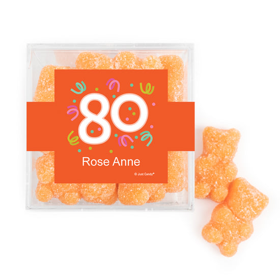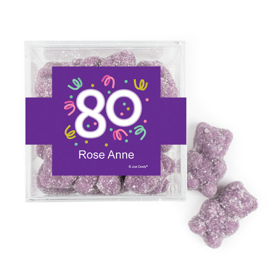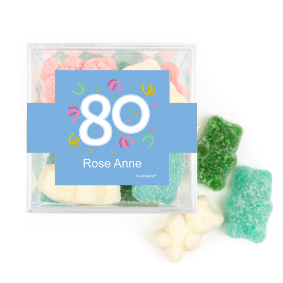 Personalized Milestones 80th Birthday Confetti JUST CANDY® favor cube with Sugar Sanded Gummy Bears