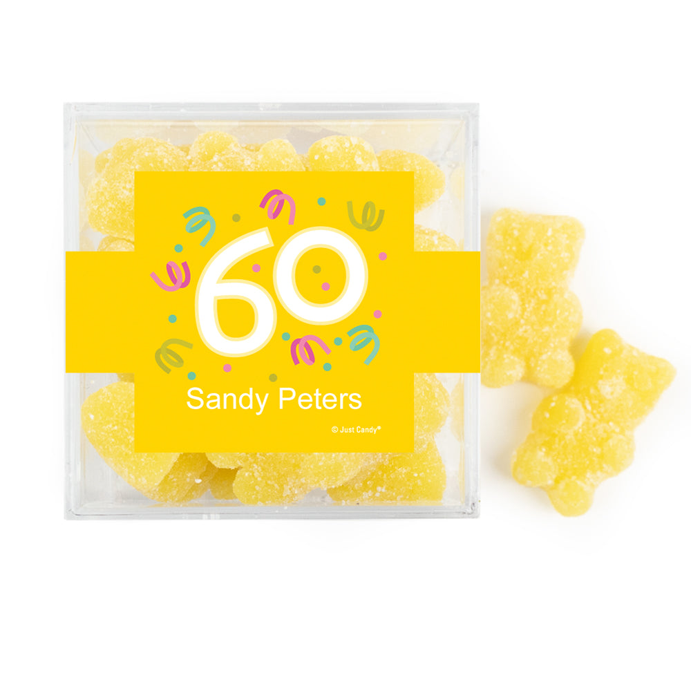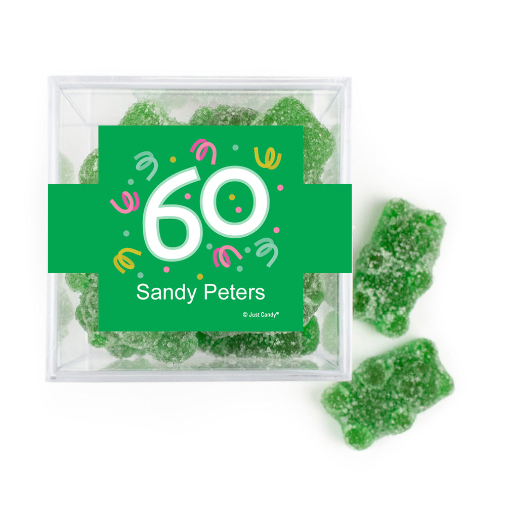 Personalized Milestones 60th Birthday Confetti JUST CANDY® favor cube with Sugar Sanded Gummy Bears