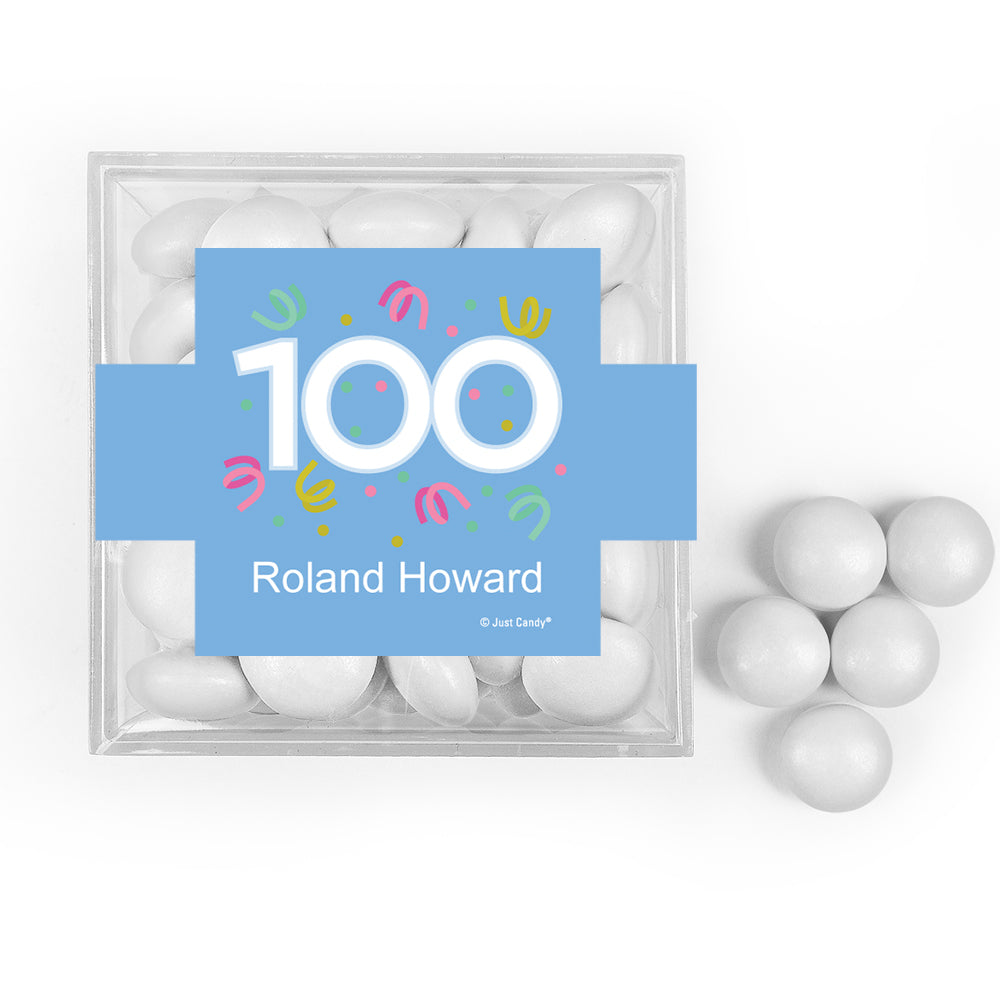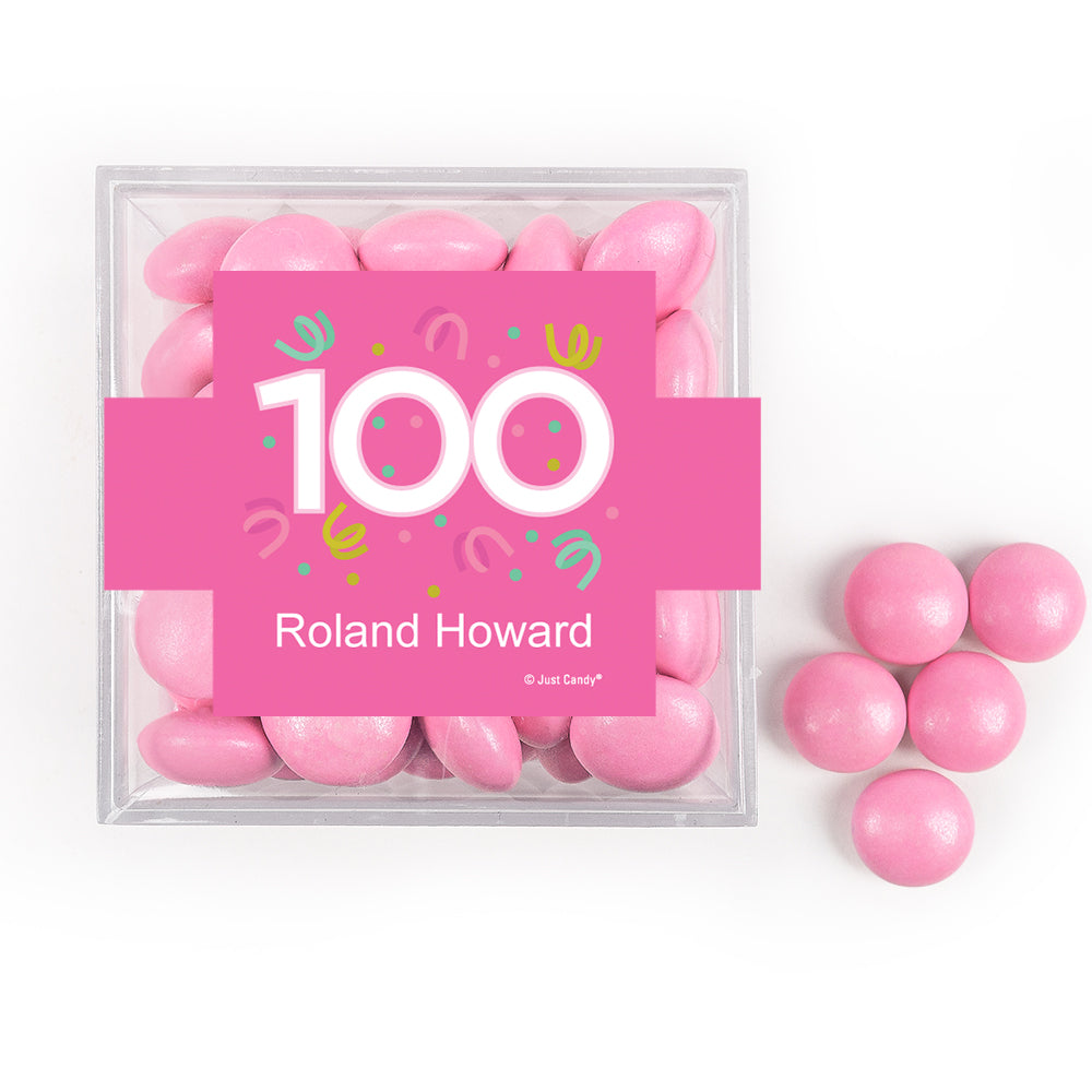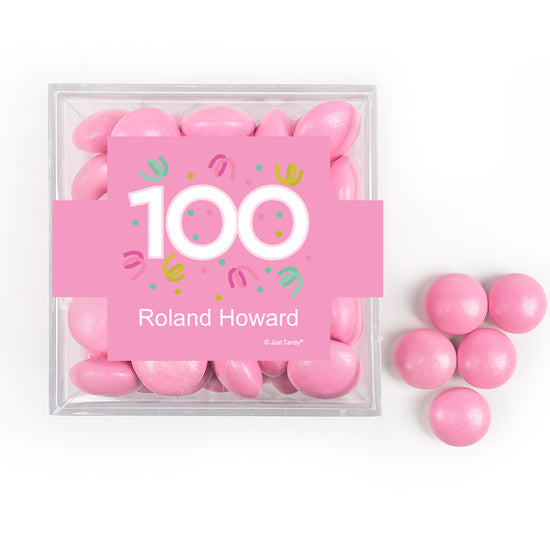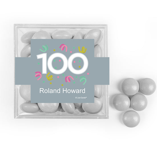 Personalized Milestone 100th Birthday Confetti JUST CANDY® favor cube with Just Candy Milk Chocolate Minis