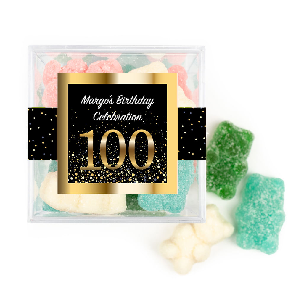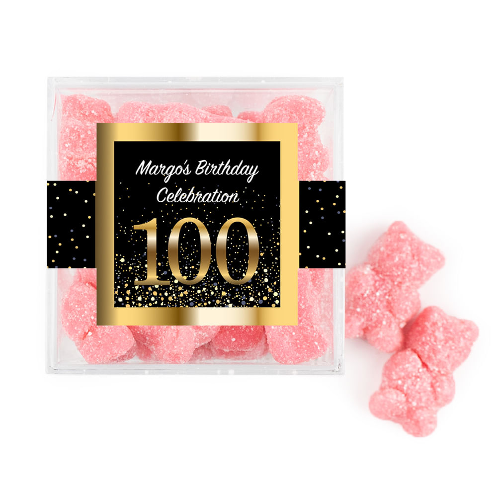 Personalized Milestones 100th Elegant Birthday Bash JUST CANDY® favor cube with Sugar Sanded Gummy Bears
