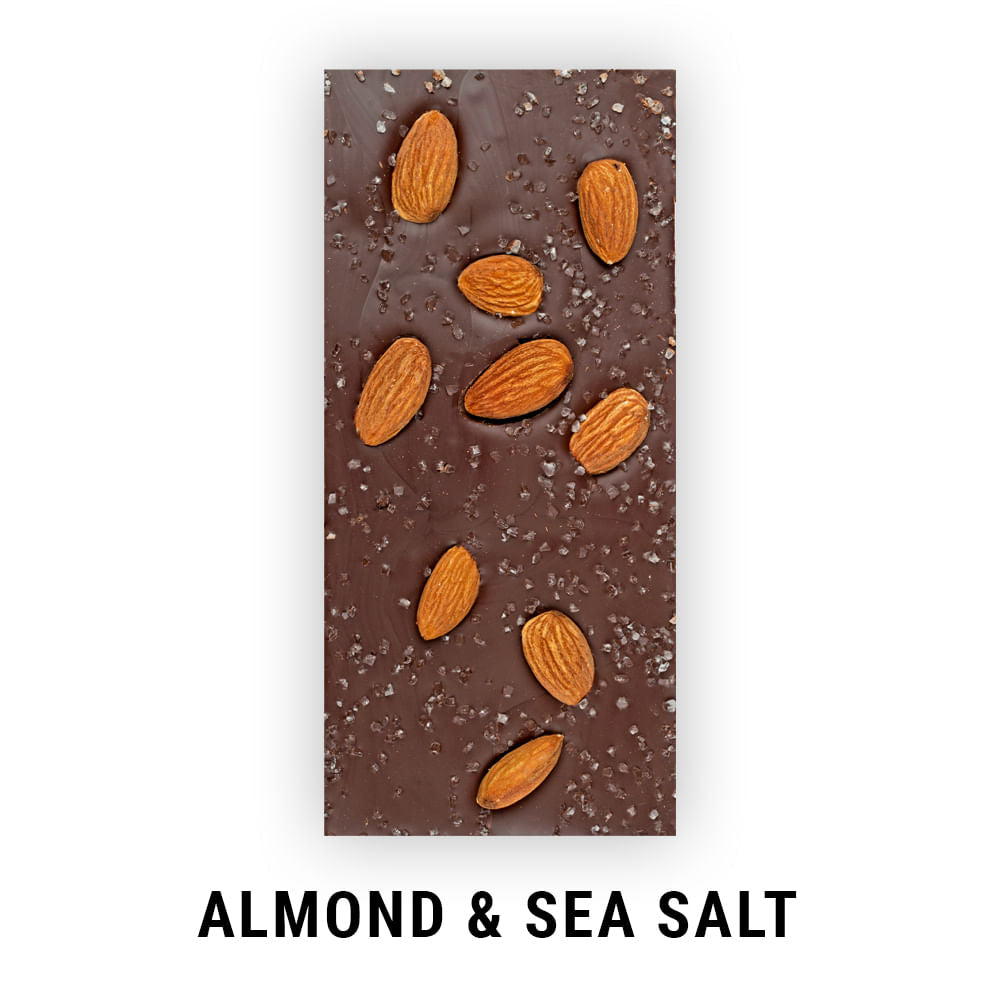 - Almond & Sea Salt: Deep, Dark Chocolate with Whole Salted Almonds floating on top with sprinkles of Sea Salt