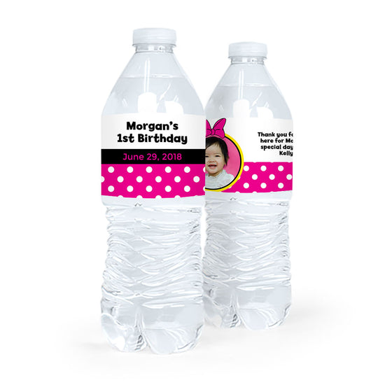 Personalized First Birthday Photo Minnie Mouse Theme Water Bottle Sticker Labels (5 Labels)