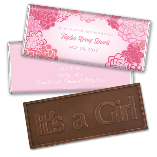 Baby Girl Announcement Personalized Embossed Chocolate Bar Pink Flowers