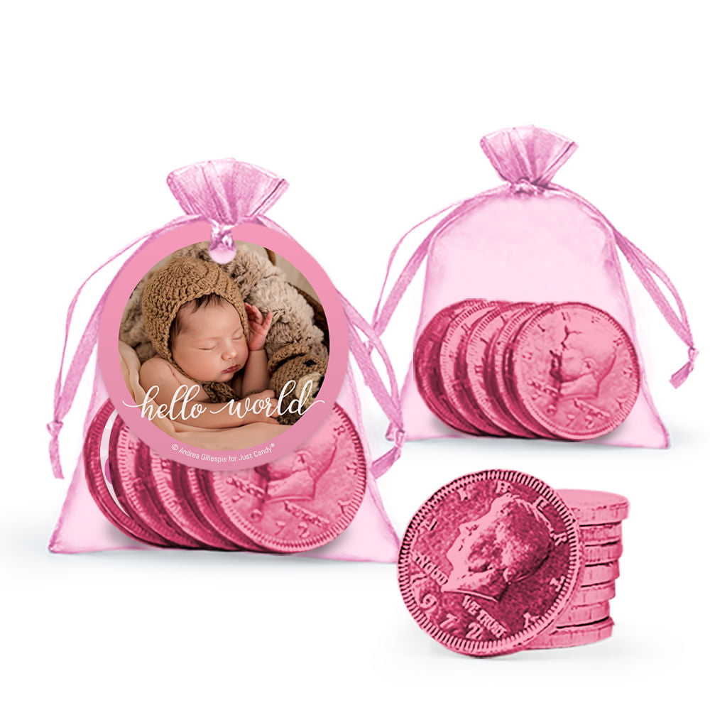 Personalized Girl Birth Announcement Hello World! Chocolate Coins in Organza Bag with Gift Tag