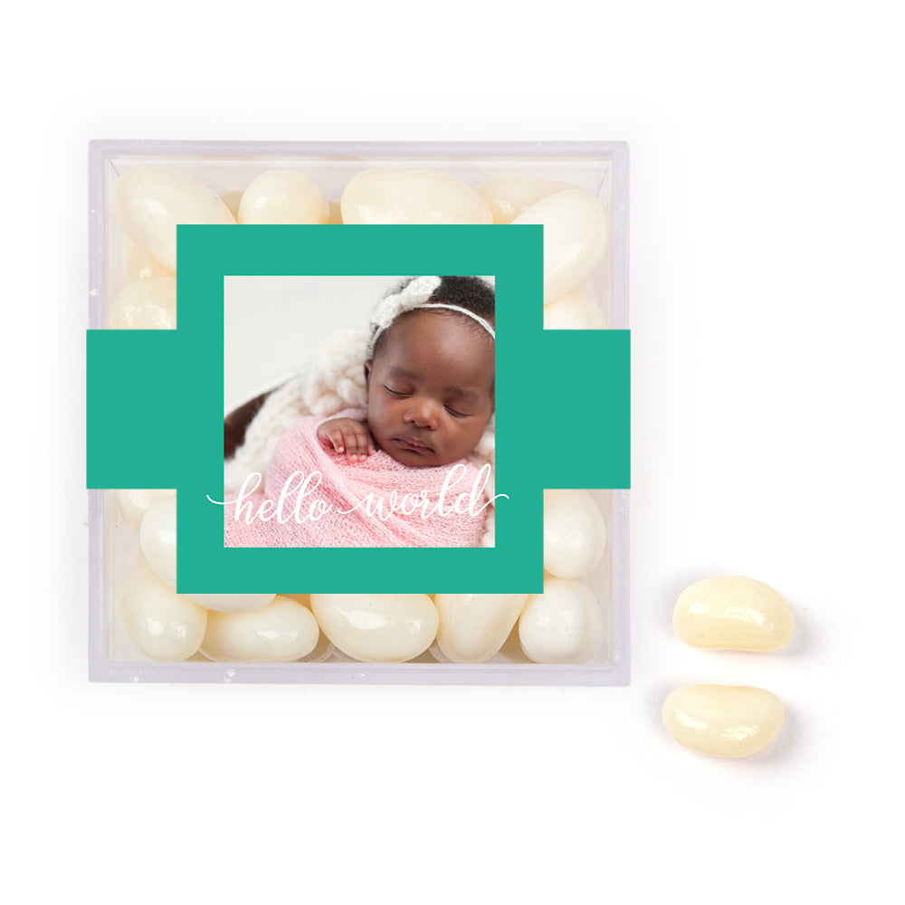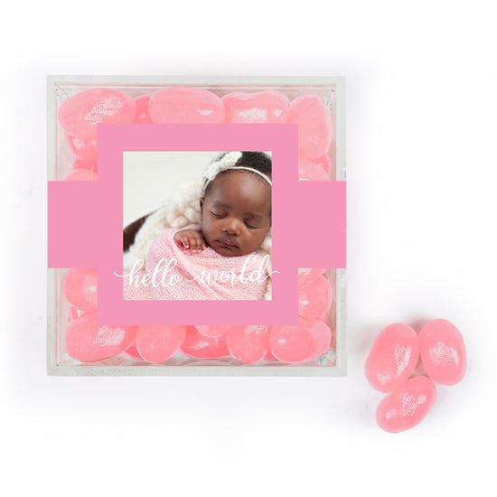 Personalized Girl Birth Announcement Hello World! JUST CANDY® favor cube with Jelly Belly Jelly Beans