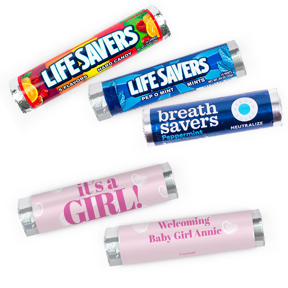 - Includes: 20 completely assembled .84oz rolls; your Choice of Pep-o-mint or 5 Flavor Life Savers Rolls with Custom Label or 24 Breath Savers Peppermint Rolls.
