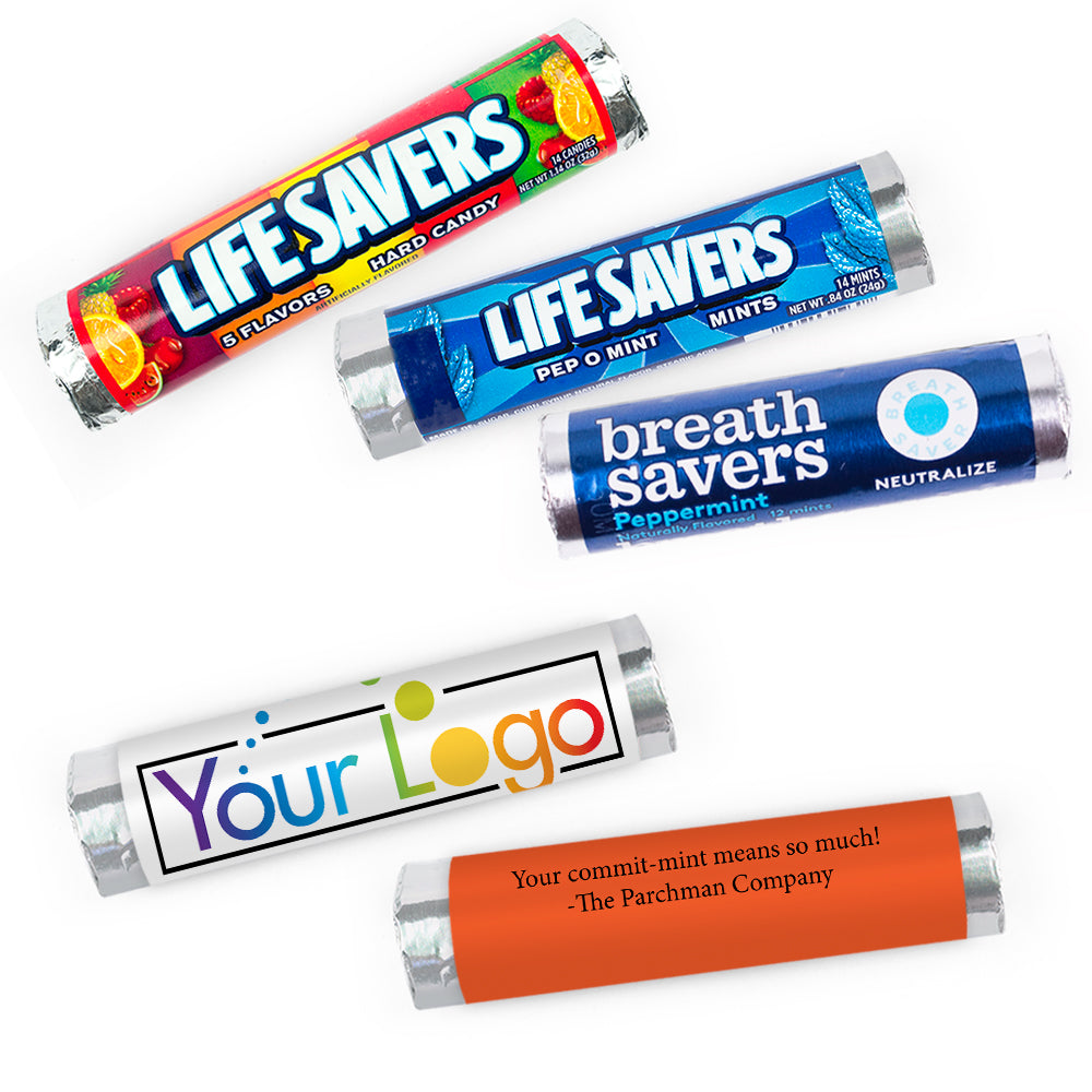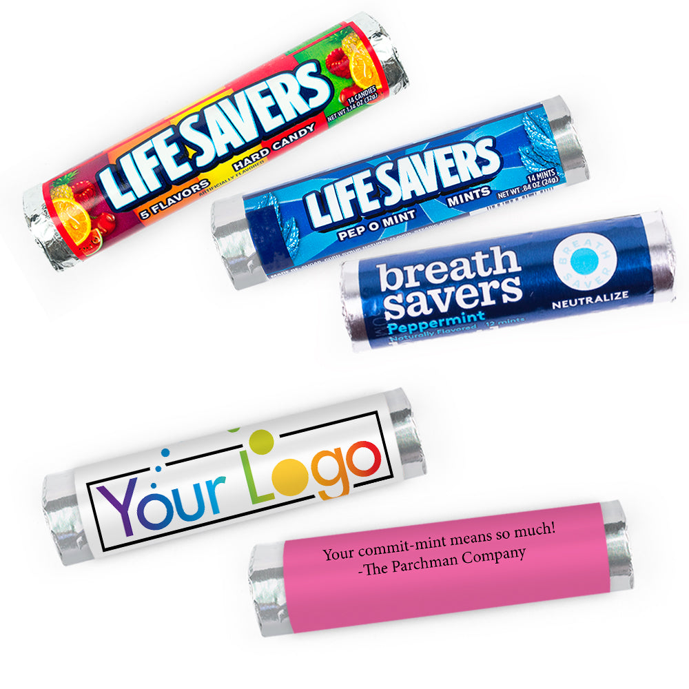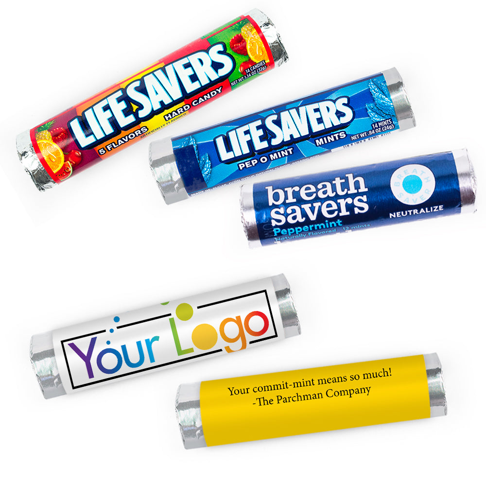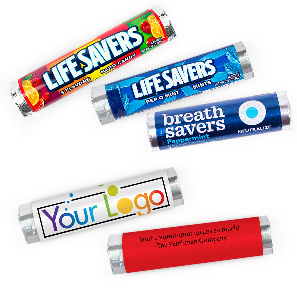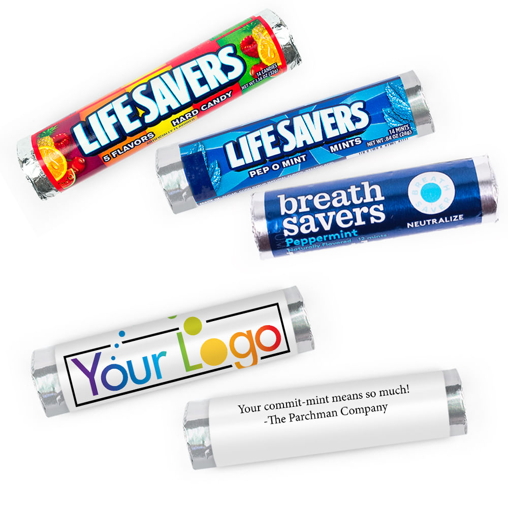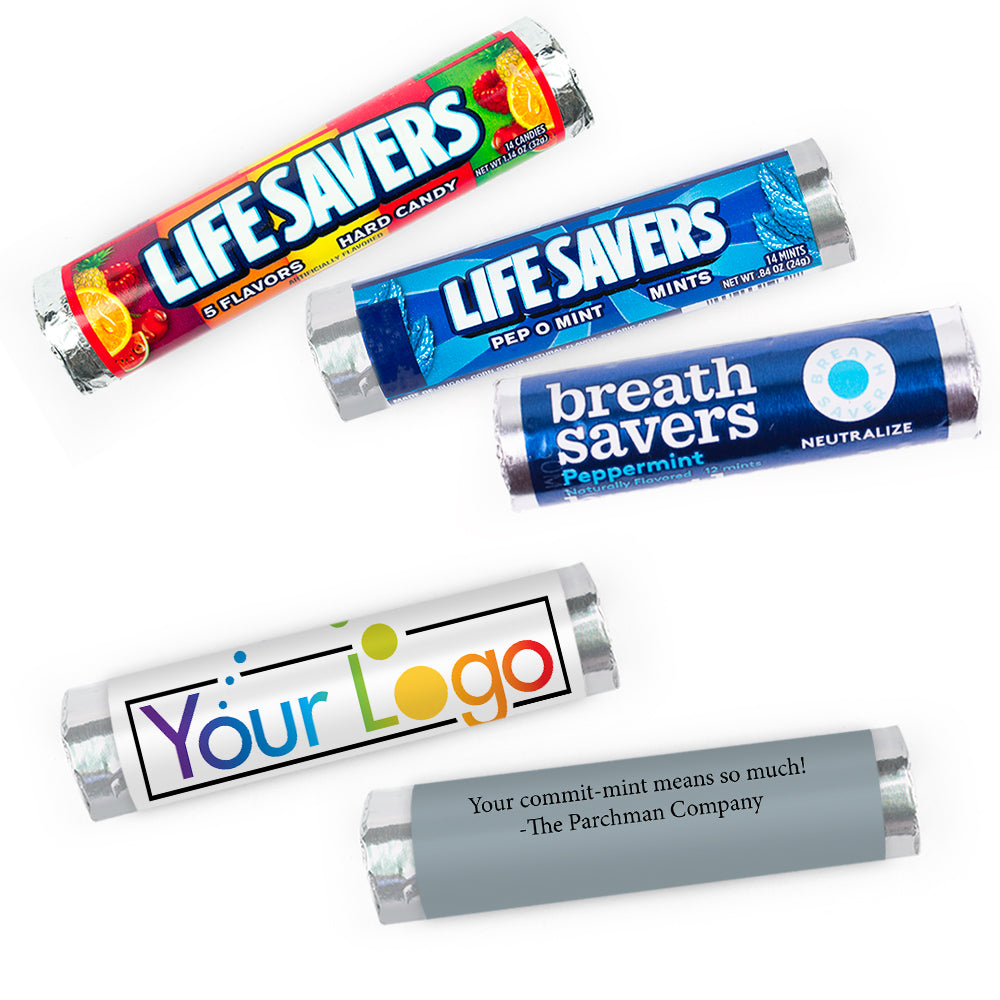 - Includes: 20 completely assembled .84oz rolls; your Choice of Pep-o-mint or 5 Flavor Life Savers Rolls with Custom Label or 24 Breath Savers Peppermint Rolls.