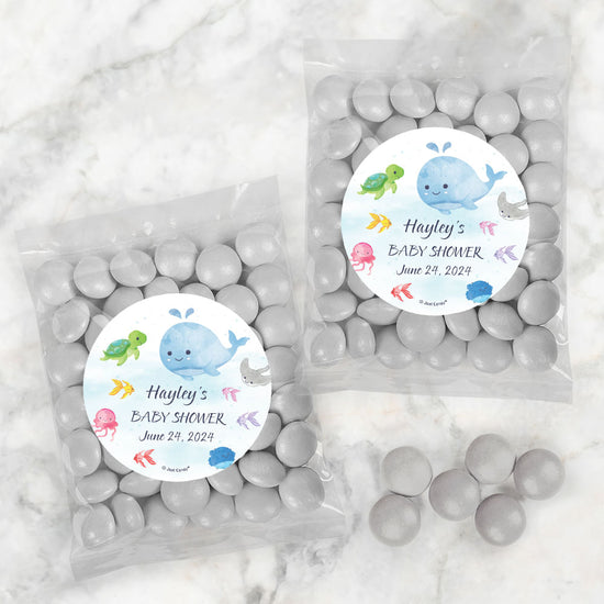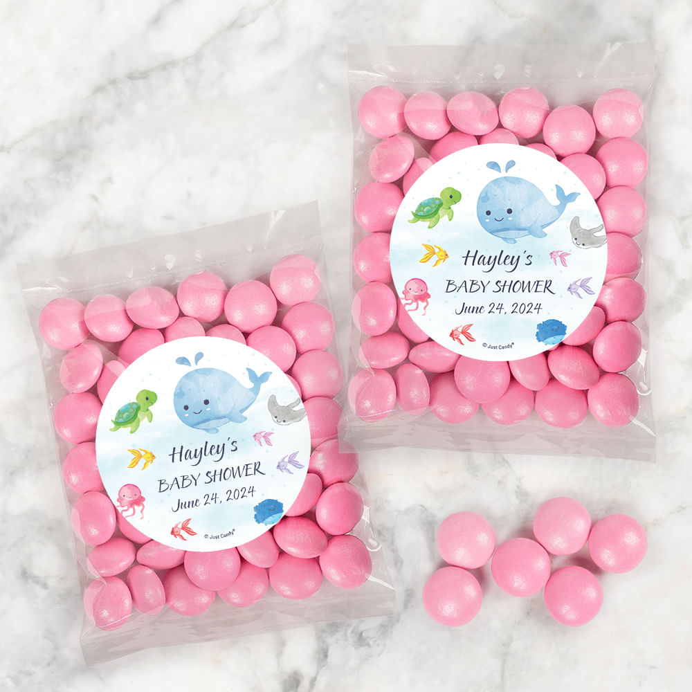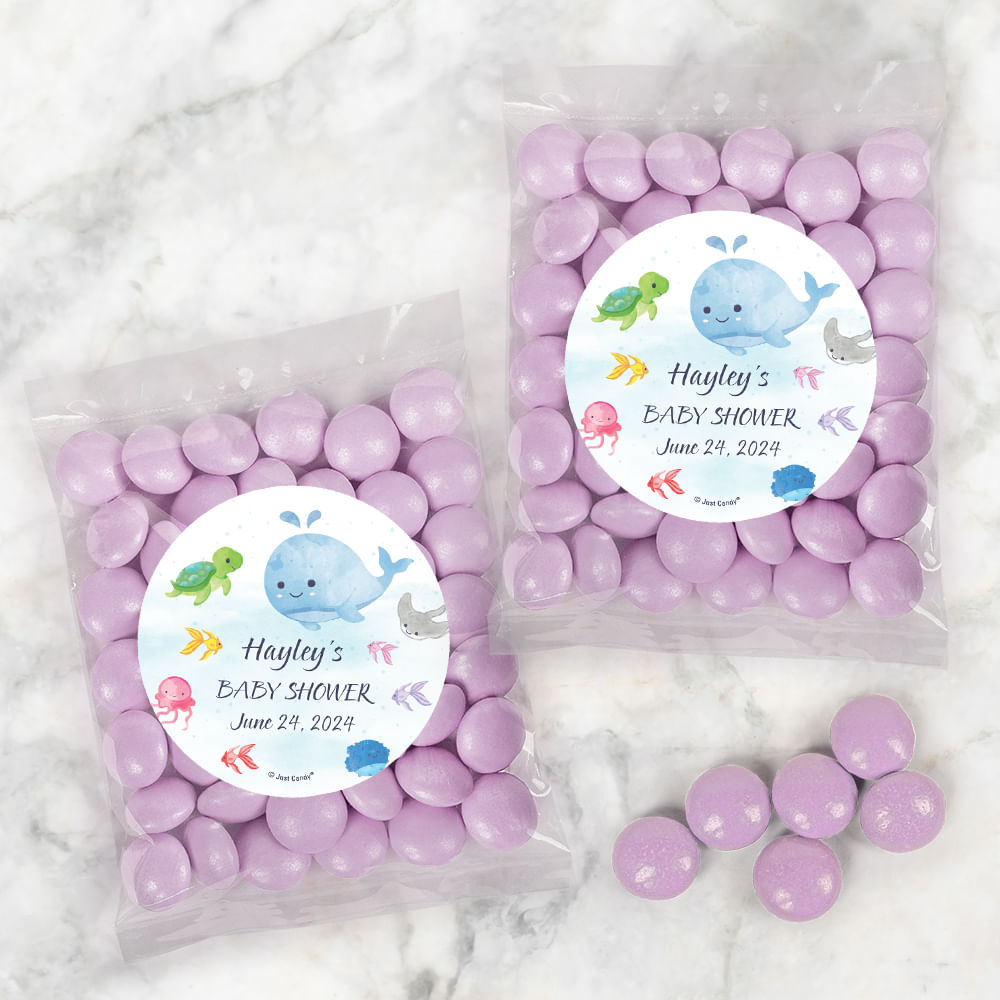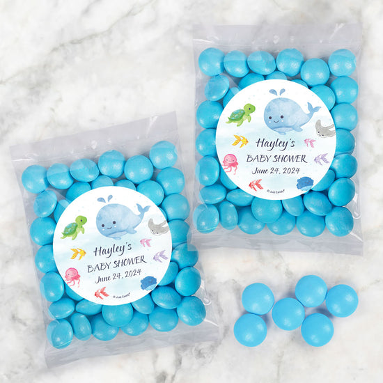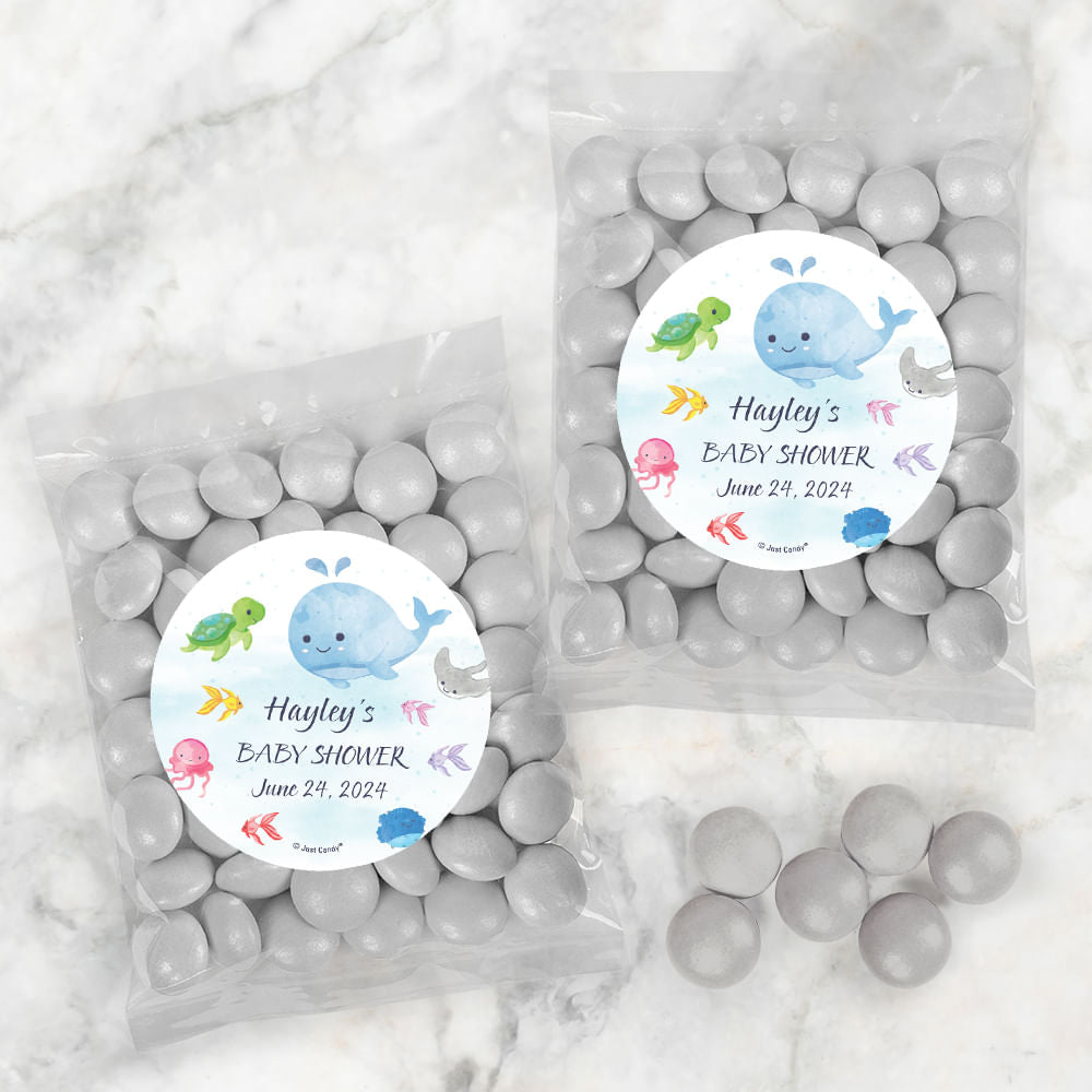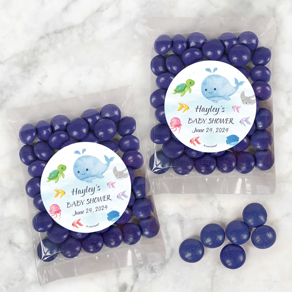 Personalized Baby Shower Whale Candy Bags with Just Candy Milk Chocolate Gems