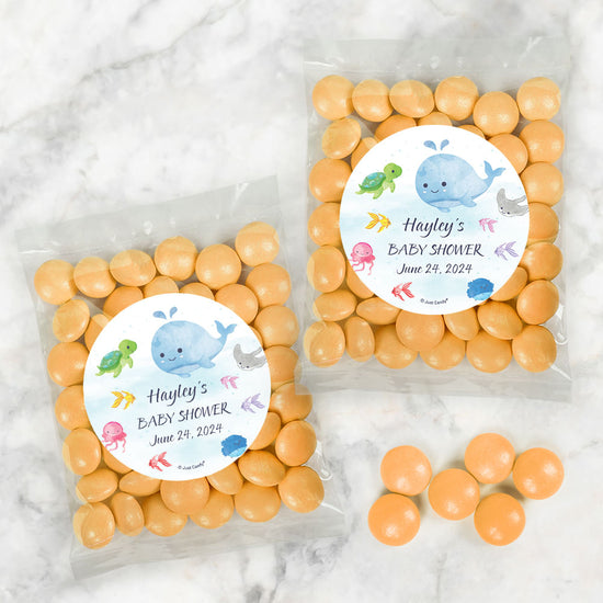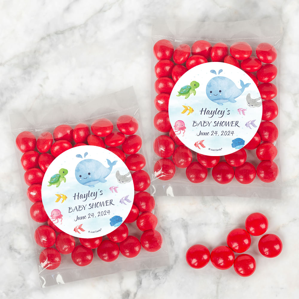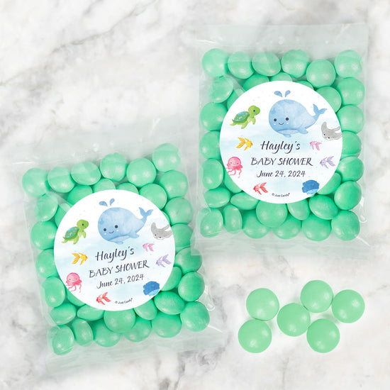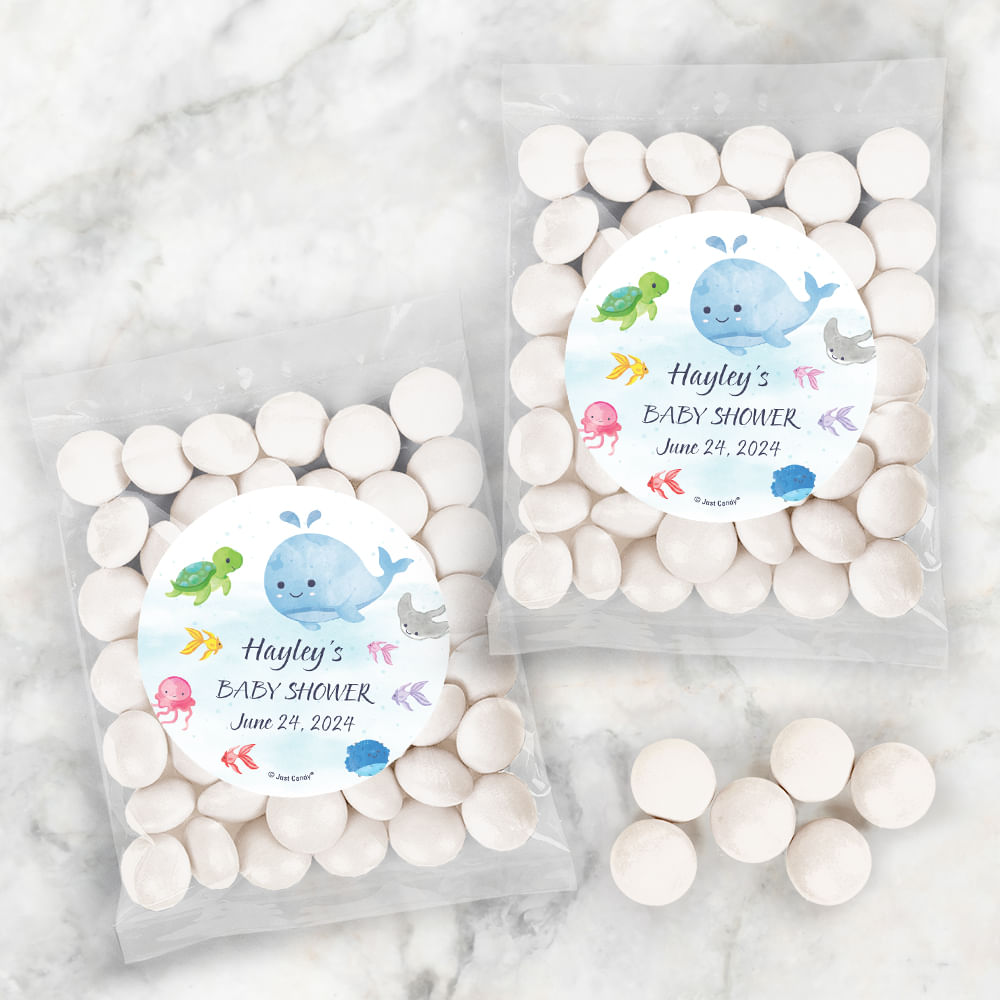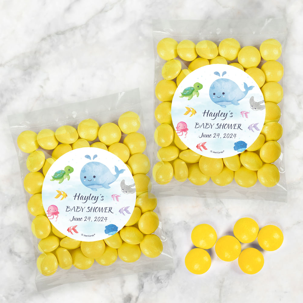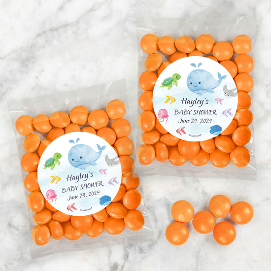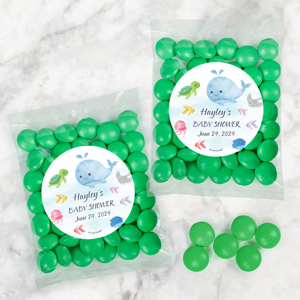 Personalized Baby Shower Whale Candy Bags with Just Candy Milk Chocolate Gems