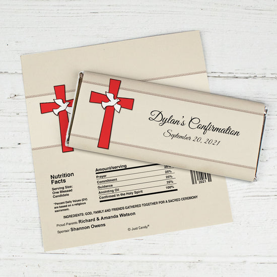Confirmation Personalized Chocolate Bar Wrappers Red Cross and Dove