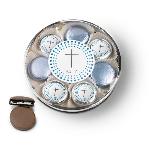 Personalized Confirmation Blue Dotted Circle Calvary Cross Chocolate Covered Oreo Cookies Large Plastic Tin
