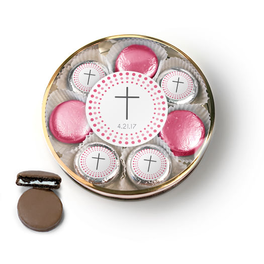Personalized Confirmation Pink Dotted Circle Calvary Cross Chocolate Covered Oreo Cookies Large Plastic Tin