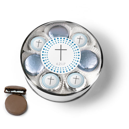 Personalized Confirmation Blue Dotted Circle Calvary Cross Chocolate Covered Oreo Cookies Extra-Large Plastic Tin