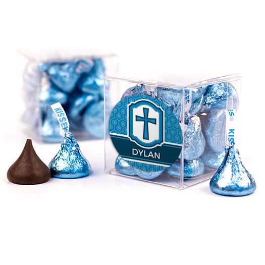 Personalized Confirmation Blue Hexagonal Pattern Engraved Cross Clear Gift Box with Sticker