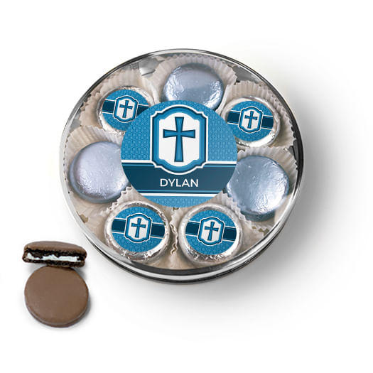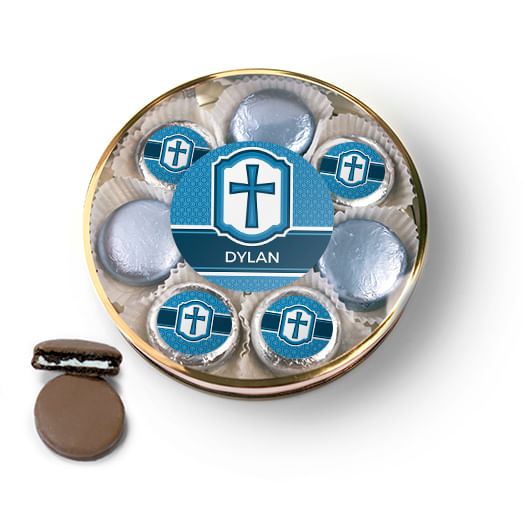 Personalized Confirmation Blue Hexagonal Pattern Engraved Cross Chocolate Covered Oreo Cookies Large Plastic Tin