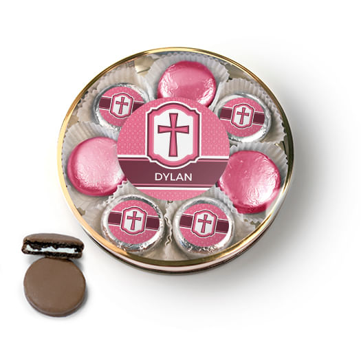 Personalized Confirmation Pink Hexagonal Pattern Engraved Cross Chocolate Covered Oreo Cookies Large Plastic Tin