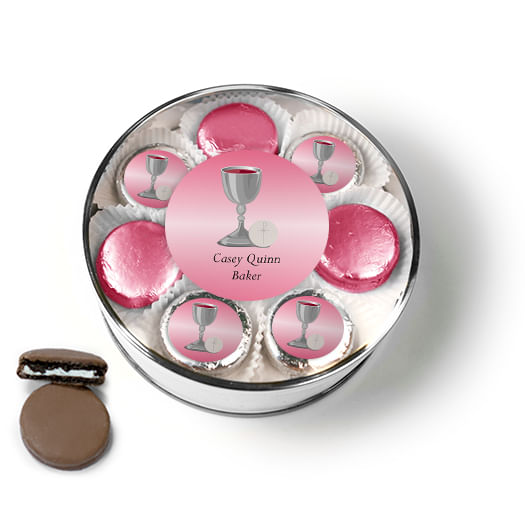 Personalized First Communion Pink Host & Silver Chalice Chocolate Covered Oreo Cookies Extra-Large Plastic Tin