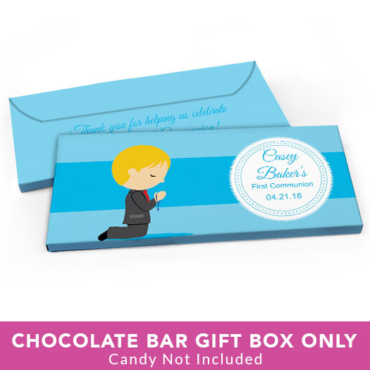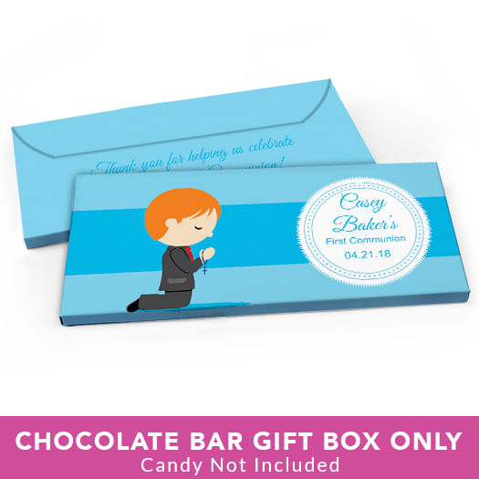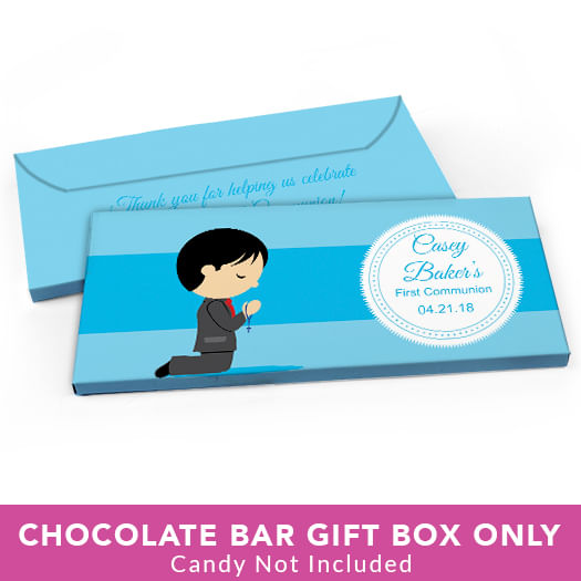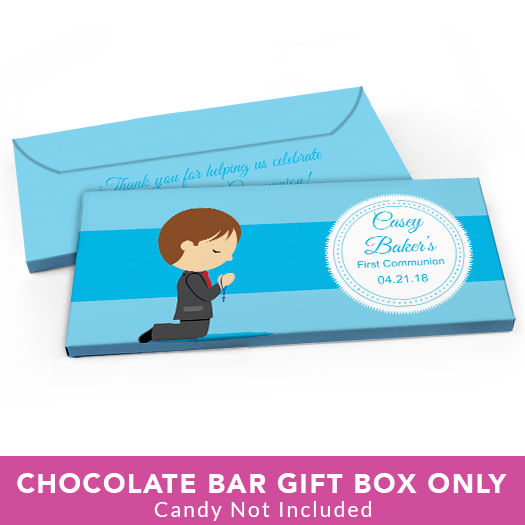 Deluxe Personalized First Communion Little Boy in Prayer Candy Bar Favor Box