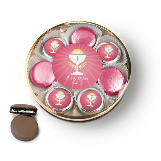 Personalized First Communion Pink Chalice & Holy Host Chocolate Covered Oreo Cookies Large Plastic Tin