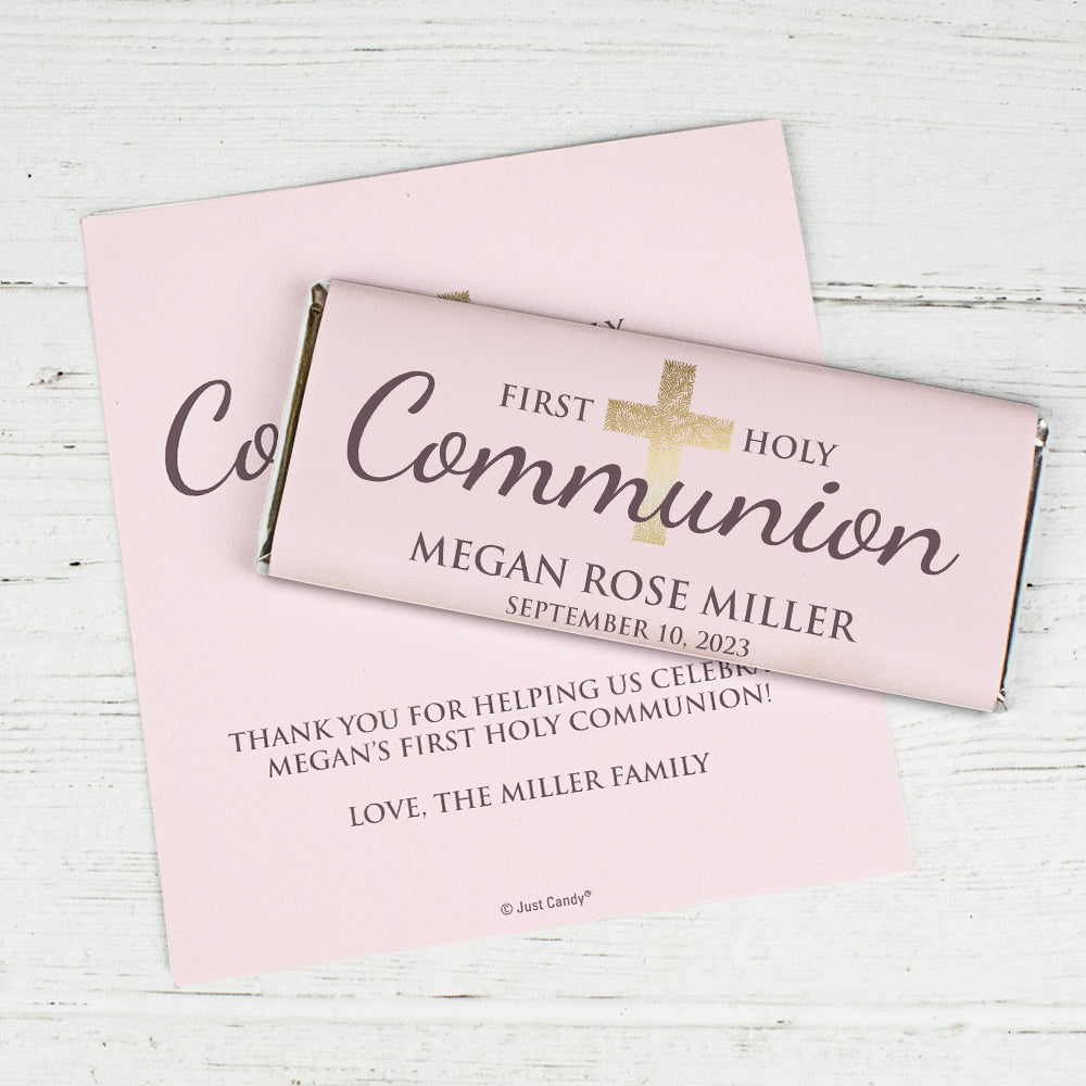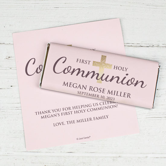 Communion Personalized Standard Chocolate Bar Wrappers - Pink & Gold (6 Wrappers Per Sheet)