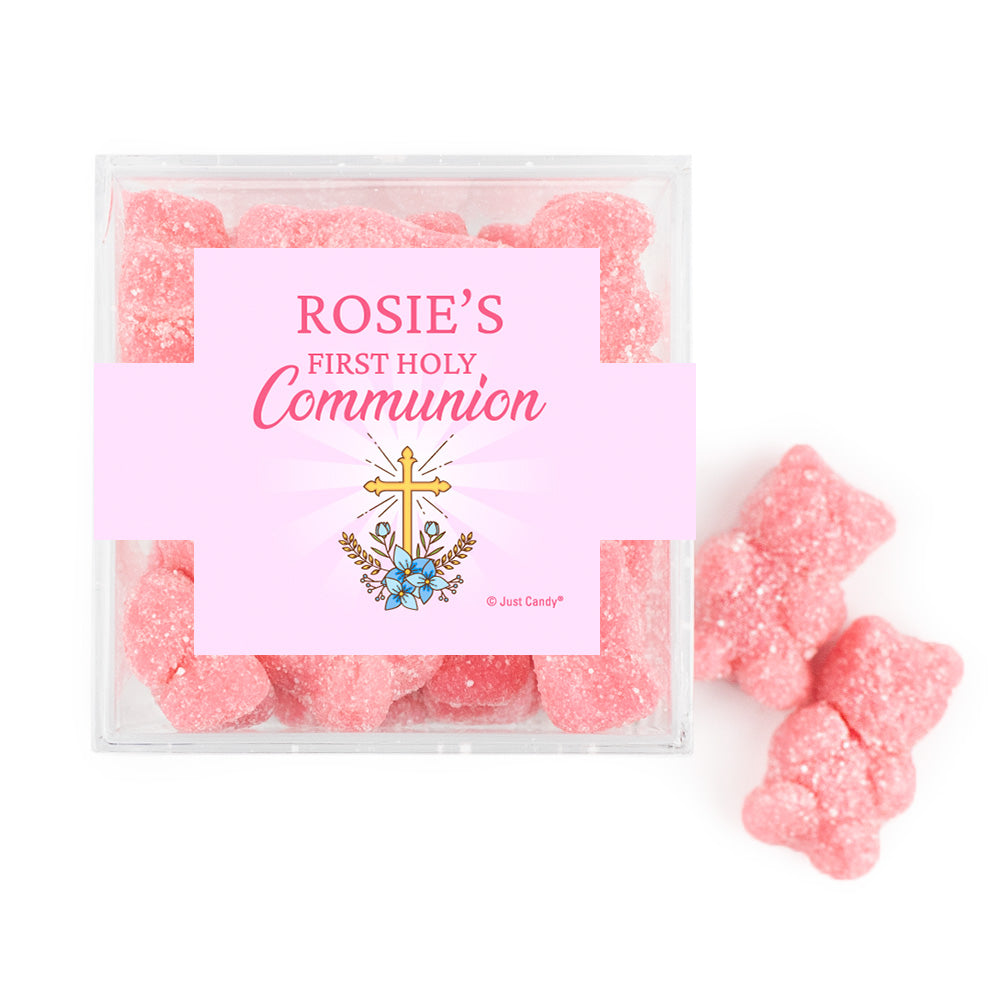 Personalized Girl First Communion Golden Cross Favor Cube with Sanded Gummy Bears