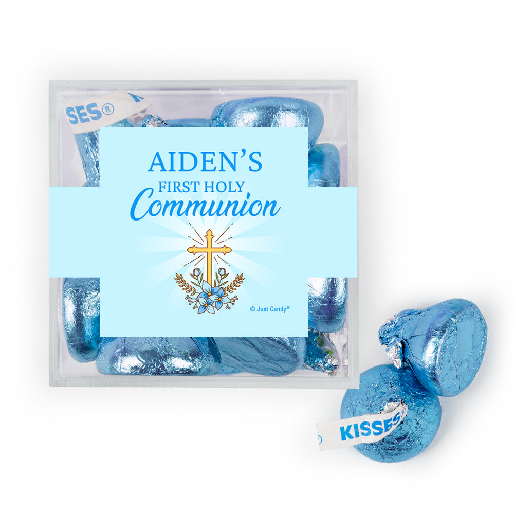 Personalized Christmas Boy First Communion Golden Cross favor cube with Hershey's Kisses