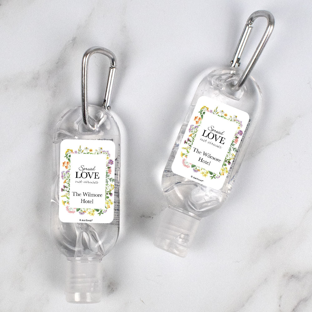 - Includes fully assembled hand sanitizer with carabiner and sticker