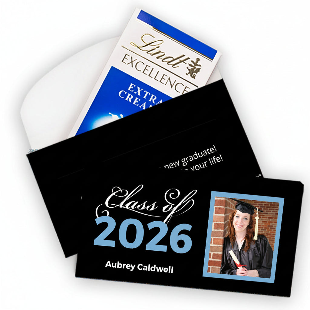 Deluxe Personalized Light Blue Graduation Class Of Lindt Chocolate Bar in Gift Box (3.5oz)