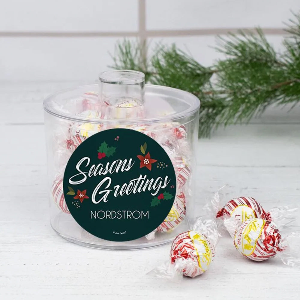 Personalized Christmas Pointsettia Season Greetings Lindor Truffles Short Canister Gift - Peppermint Truffles