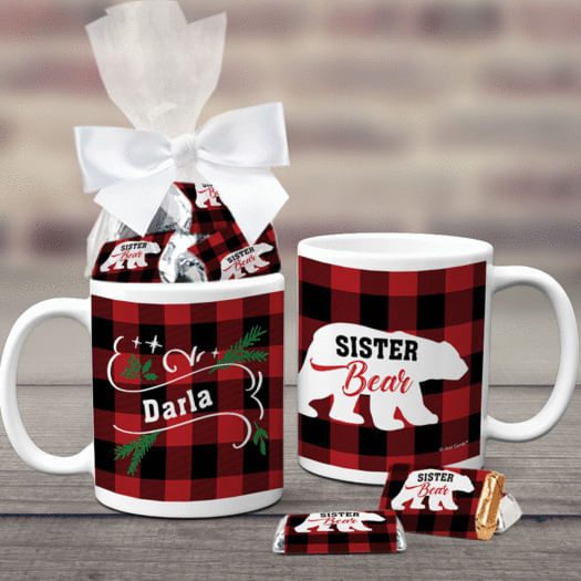 Personalized Plaid Sister Bear 11oz Coffee Mug with approx. 24 Wrapped Hershey's Miniatures