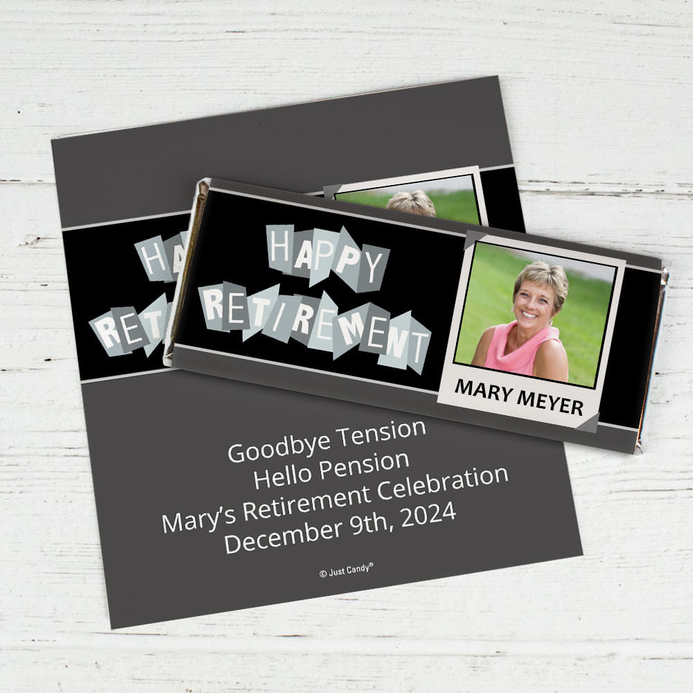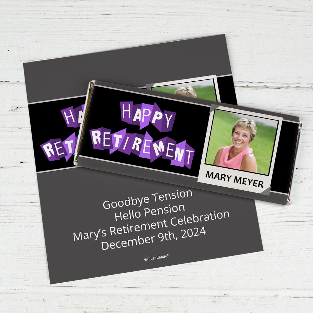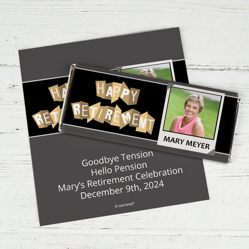 Retirement Personalized Chocolate Bar Wrappers "Happy Retirement" Polaroid Photo