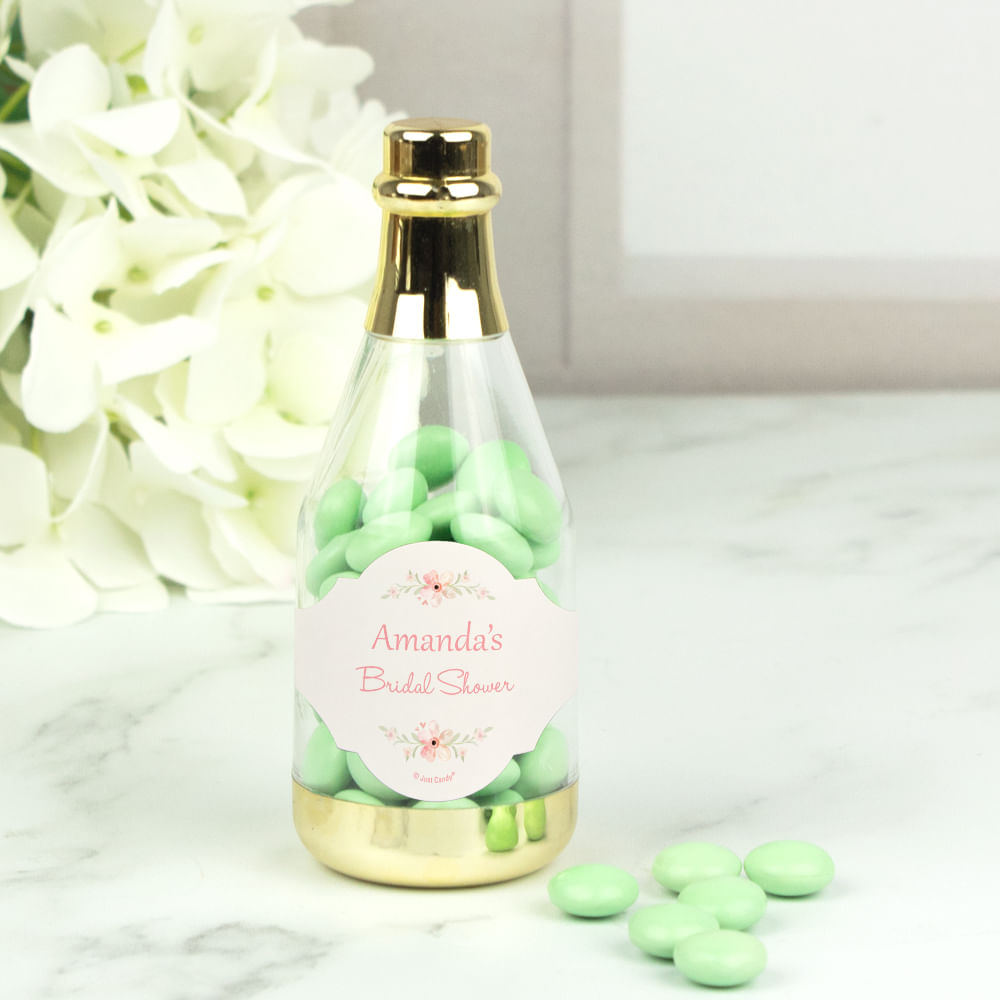 Personalized Bridal Shower Pastel Pink Flowers Champagne Bottle with Just Candy Chocolate Minis