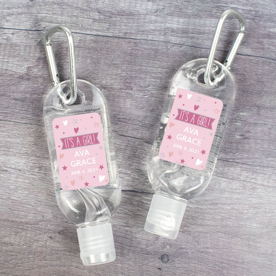 Personalized Baby Shower It's A Girl! Hand Sanitizer with Carabiner 1. fl. Oz.