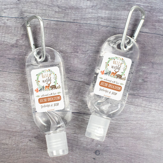 Personalized Baby Shower Hello World Hand Sanitizer with Carabiner 1. fl. Oz.